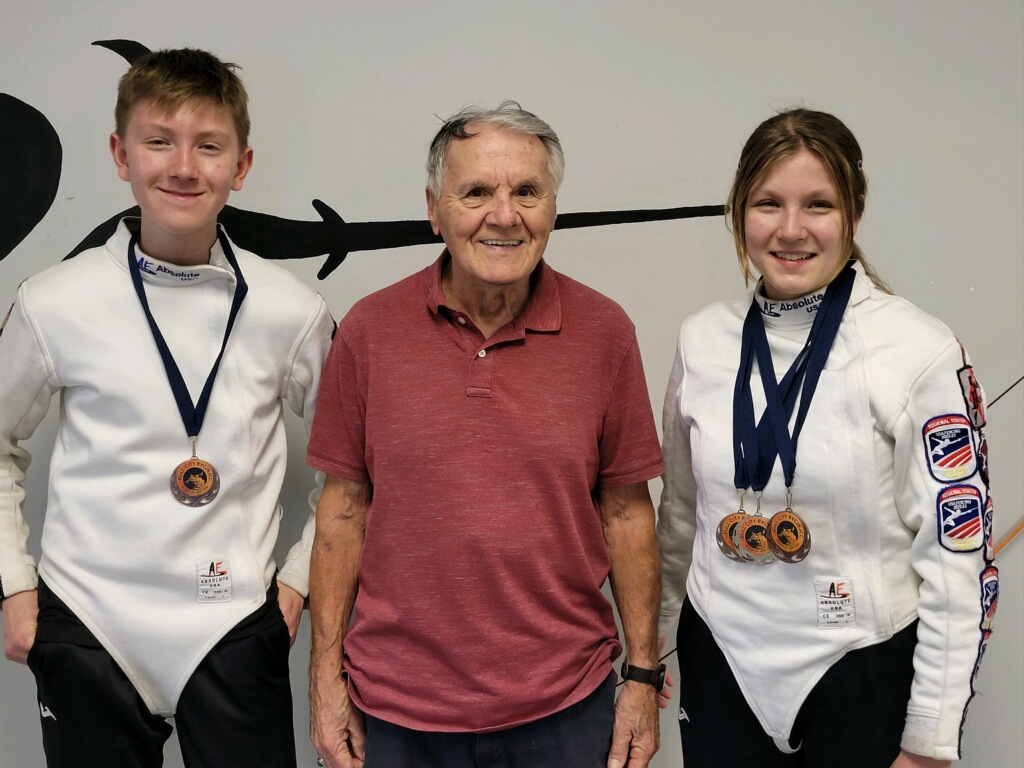 Gabriel Marisi and Gianna Marisi celebrating their impressive 4-medal haul from the Bull City Fencing Tournament, captured inside our salle.