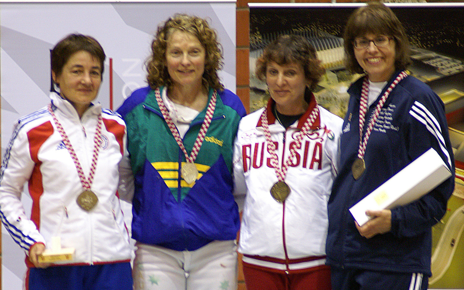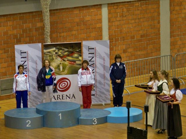Marianne Bosco, our Assistant Coach and wife of Charles Bosco, proudly displaying her medal from international epee competition in Croatia.